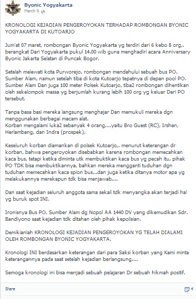 Kemudian ini kronologis kejadian versi Byonic Yogyakarta, bersumber dari akun facebook Byonic Yogyakarta hari Minggu, 9 Maret 2014 jam 16.00.
